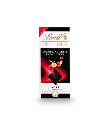 Ingredienti: Cioccolato fondente con mandorle, nocciole e mirtilli rossi. Ingredienti: zucchero, pasta di cacao, burro di cacao, mirtilli rossi 3,5%, BURRO anidro, MANDORLE 3,3%, NOCCIOLE 2%, emulsionante (lecitina di SOIA), destrosio, Fleur de sel (sale) 0,1%, aroma. Può contenere SEMI DI SESAMO, ed altra FRUTTA A GUSCIO. Cioccolato fondente - Cacao: 47% minimo.