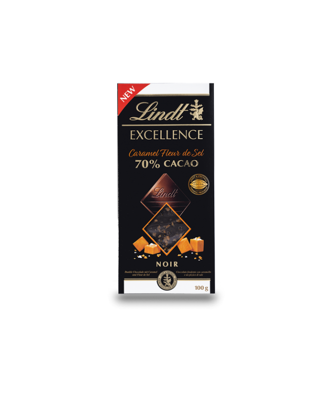 Ingredienti: Cioccolato fondente con pezzetti di caramello e sale marino. Ingredienti: pasta di cacao, zucchero, burro di cacao, cacao magro in polvere, caramello 8% (zucchero, burro di cacao, LATTOSIO, BURRO anidro, LATTE scremato in polvere, sale, aroma, emulsionante (lecitina di colza)), sale marino (Fleur de Sel) 0,3%, aroma, vaniglia. Può contenere NOCCIOLE, MANDORLE, SOIA ed altra FRUTTA A GUSCIO. Cioccolato fondente - Cacao: 70% minimo.