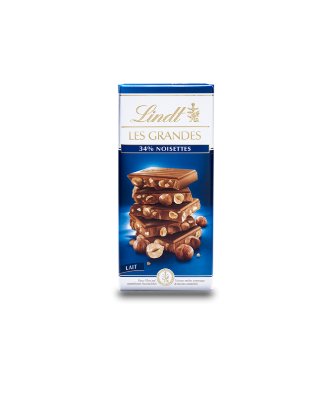 Ingredienti: Cioccolato al latte con nocciole. Ingredienti: zucchero, NOCCIOLE (34%), burro di cacao, pasta di cacao, LATTE intero in polvere, LATTOSIO, LATTE scremato in polvere, BURRO anidro, emulsionante (lecitina di SOIA), estratto di malto d’ORZO, aromi, MANDORLE. Può contenere altra FRUTTA A GUSCIO. Cioccolato al LATTE - Cacao:34% minimo.