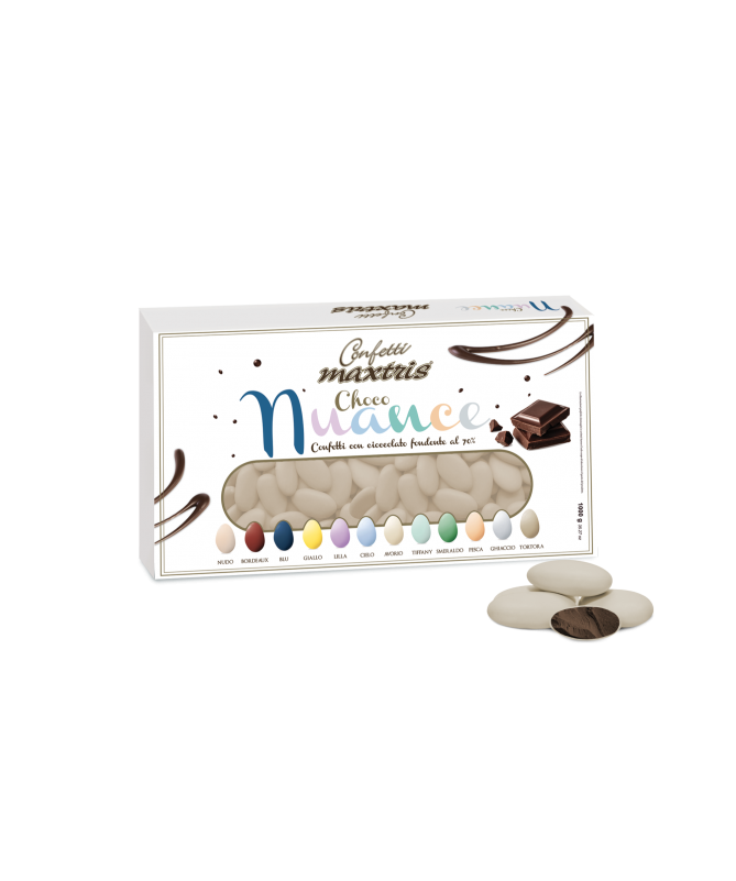Zucchero, cioccolato fondente (45%) (zucchero, burro di cacao, pasta di cacao. Emulsionante: lecitina di soia. Aroma naturale di vaniglia), amido, maltodestrina. Colorante: E171. Agenti di rivestimento: cera carnauba (E903), cera d'api (E901). Coloranti esterni: se nudo (E120, E102*), se bordeaux (E129, E122*, E132), se blu (E132), se giallo (E100, E102*), se lilla (E120, E133), se cielo (E133, E132, E151), se avorio (E150d), se tiffany (E133, E102*, E100), se smeraldo (E133, E100), se pesca (E120, E102*, E100), se ghiaccio (E151), se tortora (E151, E132), se nero (E151, E153), se magenta (E120). (*) può influire negativamente sull’attenzione e l’attività dei bambini. Può contenere latte e prodotti a base di latte (incluso lattosio), mandorlenocciolenocinoci di pecannoci di acagiù (o anacardi), pistacchi e arachidi.